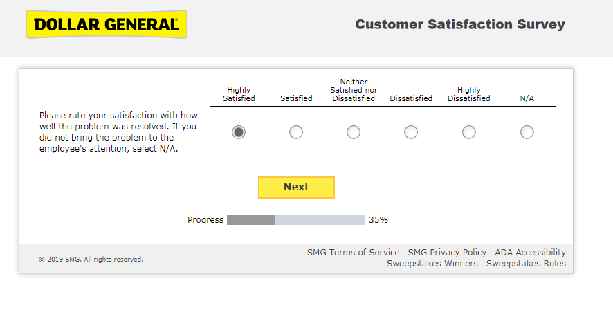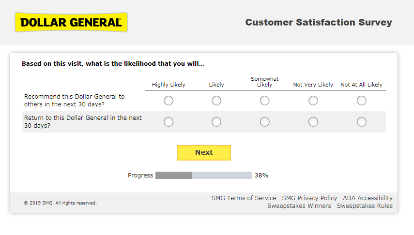 DG Customer First Survey - Next page on DGCustomerFirst will ask you basic survey questions based on your recent visit. The questions will be about the cleanliness of the store, the availability, and prices of products, and the assistance you get. Rate each one with Highly Satisfied as the highest and Highly Dissatisfied as the lowest.