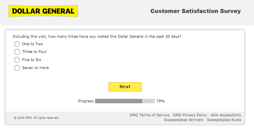 - This question will ask you to mark the corresponding answer to how many times you have visited the specific Dollar General store during the past 30 days.