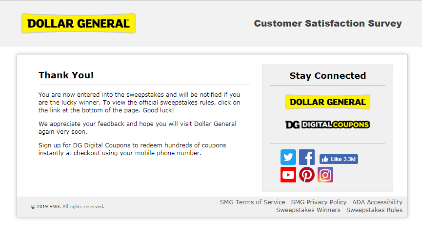 The DGCustomerFirst Survey gives out coupon prizes of $3 to $15 per coupon as well as a $100 sweepstake lottery prize, where 4 winners are announced every week. Customers can enter only once per sweepstake and must be over 18 years of age and live only in the USA.