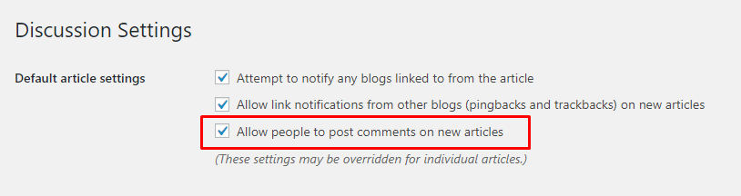 For sites that don’t need any interaction with visitors, WordPress provides a tool to disable comments altogether. To activate the feature, go to WordPress Settings > Discussion > Default article settings > Uncheck ‘Allow people to post comments on new articles’ box.