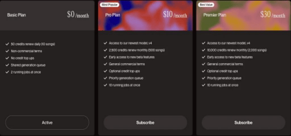 Suno offers a range of plans designed to cater to different needs and budgets, ensuring everyone can findthe right fit for their music creation journey. If you’re experimenting or just starting out, the Basic Planis completely free and ideal for trying out Suno’s features. For those looking to monetize their creations, the Pro Plan provides professional-level tools to turn your work into a business. Creators requiring large-scale production can benefit from the Premier Plan, which delivers the volume and speed necessaryfor high-efficiency projects. Students on a budget can access pro-level features with the Student Plan, offering premium capabilities at a lower cost. No matter your level of expertise or goals, it provides flexible options to support your creative aspirations.