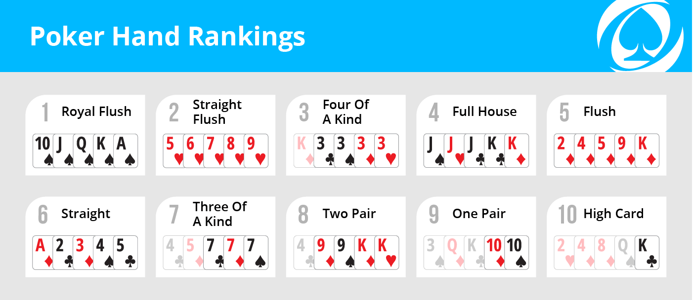 - Hand Rankings: Poker has various versions, but they all use the same hand rankings from high to low: Royal Flush, Straight Flush, Four of a Kind, Full House, Flush, Straight, Three of a Kind, Two Pair, One Pair, High Card.