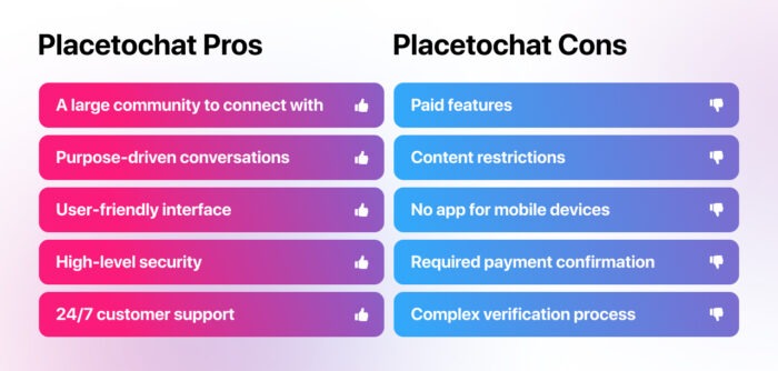 Considering the information above and my experience with Placetochat, let’s break down the pros and cons of this communication website.