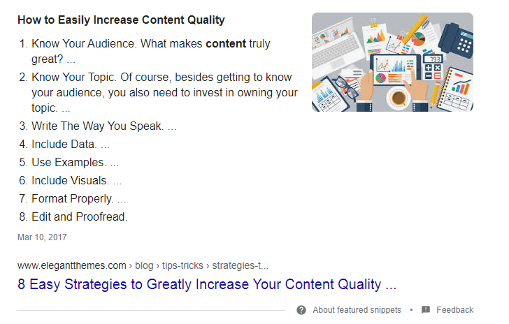 Featured content can be paragraphs, lists, video, tool, and calculator. Getting your content to land a featured snippet means making it high-quality and hitting the right search intent.