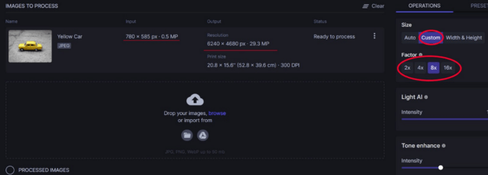 After uploading your image, you can choose your desired size, resolution, and other image upgrade factors.