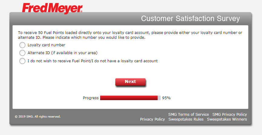- Answer whether you will be providing your loyalty card or alternate ID to receive the 50 fuel points from Kroger. You can also opt out of the free fuel points by choosing the 3rd option.